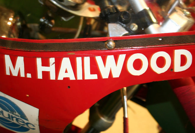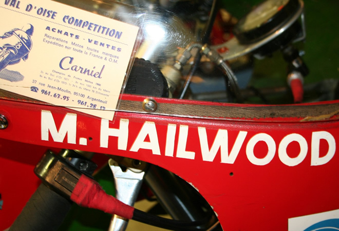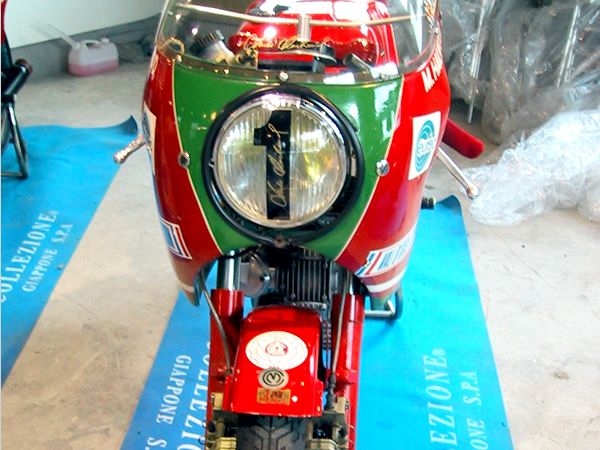 Otherwise, whole parts including a shield and painting are genuine. In a front fairing, there is a handwriting signature "Mike Hailwood".
