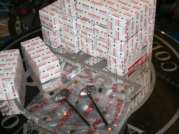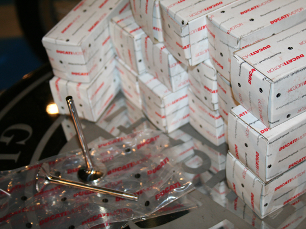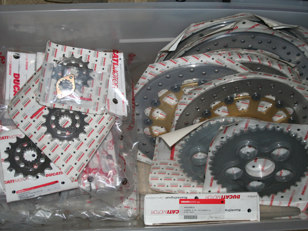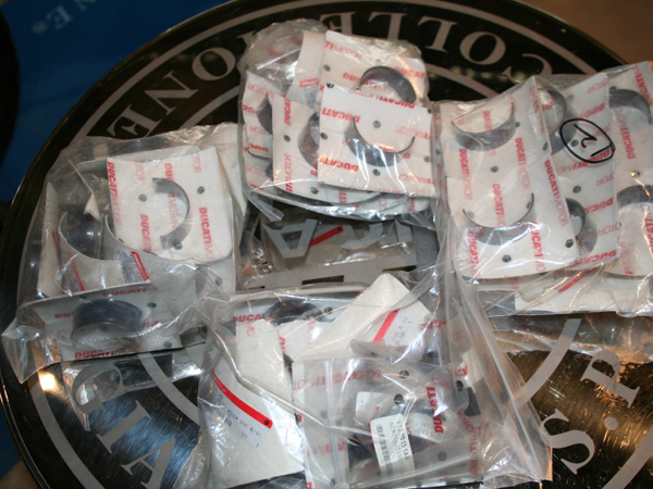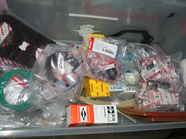 所有する、#2FACTORY996の、スペアーパーツ。勿論メーカーから買い付けたものであることは言うまでもない。ヘッド、クランクケース(3〜4基ある)クランク、ピストン(数セット多数)、バルブ(多数)、大きなものから、細かなオーリング、ナット、ボルトまで様々なストックがある。おそらくレースをするわけでないので、死ぬまでに使い切らないだろう。なくなるということだったので、まとめ買いをした。写真も大体にしたが、全部とっていると何日かかるかわからない。