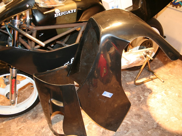 #618いわゆるルッキネリーが乗っていたころの、ロッカーラパイド用のフルカウリング、当社コンプレッドBIKEについていたものと同じもの、一見スタンダードF-1カウルに同じように見えるが、形状や、寸法が全く違う、特にステムから、タンクにかけて非常に長く勿論フロントのアールも独特である。このカウリングは、イタリアで本物のファクトリーバイクからかたどられたもので、ステッカーの形や、ゼッケンの形までが浮き文字で残る。価格はお問い合わせ。